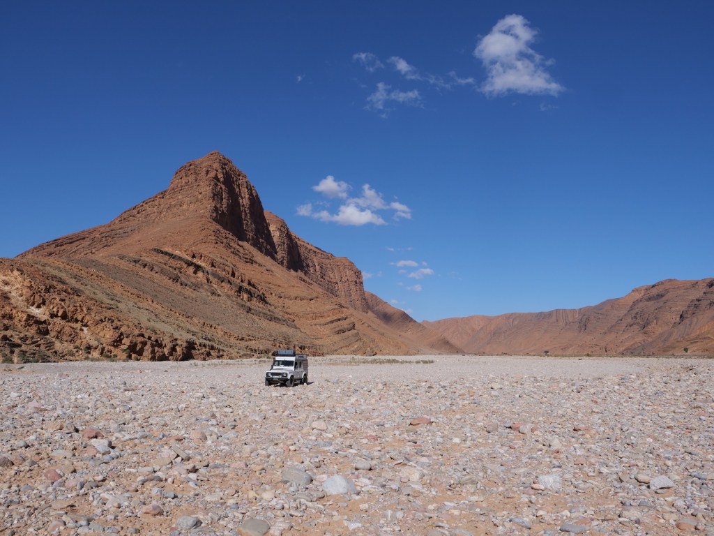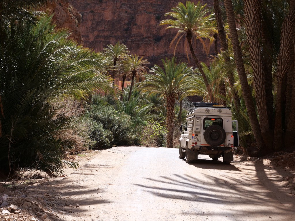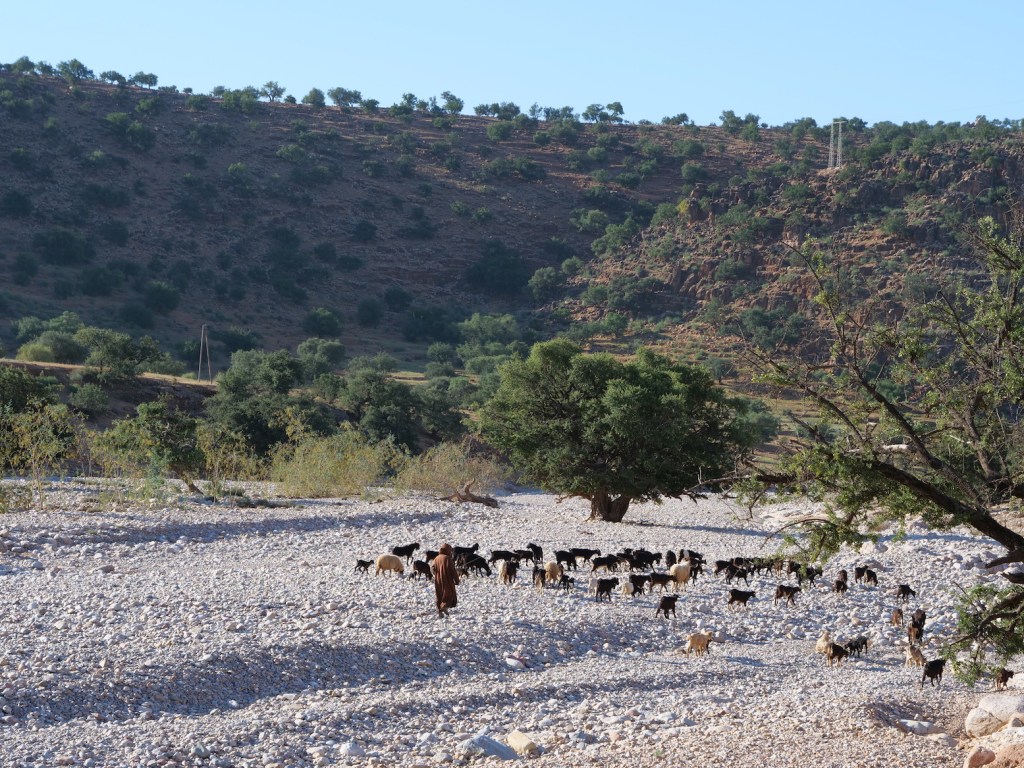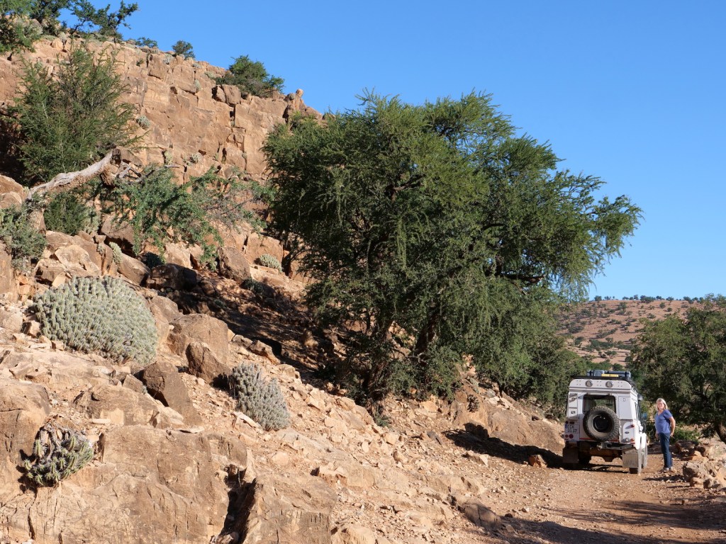 Sobald der Defender die asphaltierten Wege im Norden des Antiatlas verlässt, wird es ruhig und schön. Größtenteils trocken gefallene Flusstäler durchschneiden die Hochebenen, auf denen die Bevölkerung der verstreut liegenden Dörfer einfachen Ackerbau betreiben, die Früchte der Arganbäume reifen und die Ziegen gerne auch mal in die Bäume klettern, um zu fressen.