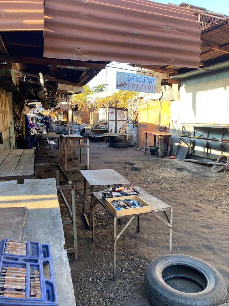 • Nach mindestens drei Nachfragen bezüglich des Bolzens bekomme ich den Tipp, es doch eher am Eliava-Markt zu versuchen. Dort angekommen, finde ich einen unübersehbar großen Schrottplatz vor, der sich als eine Ansammlung von Altteileverwertern entpuppt. Zwielichtige Gestalten waten durch Pfützen von Altöl, ich ärgere mich, dass ich meine Sicherheitsschuhe nicht angezogen habe.