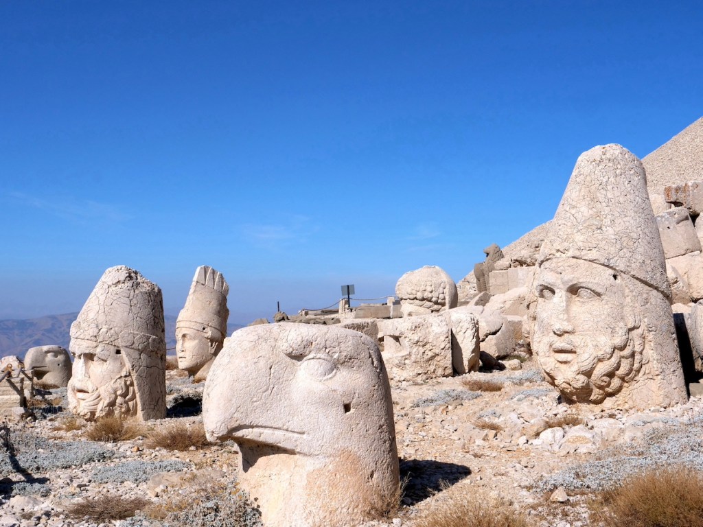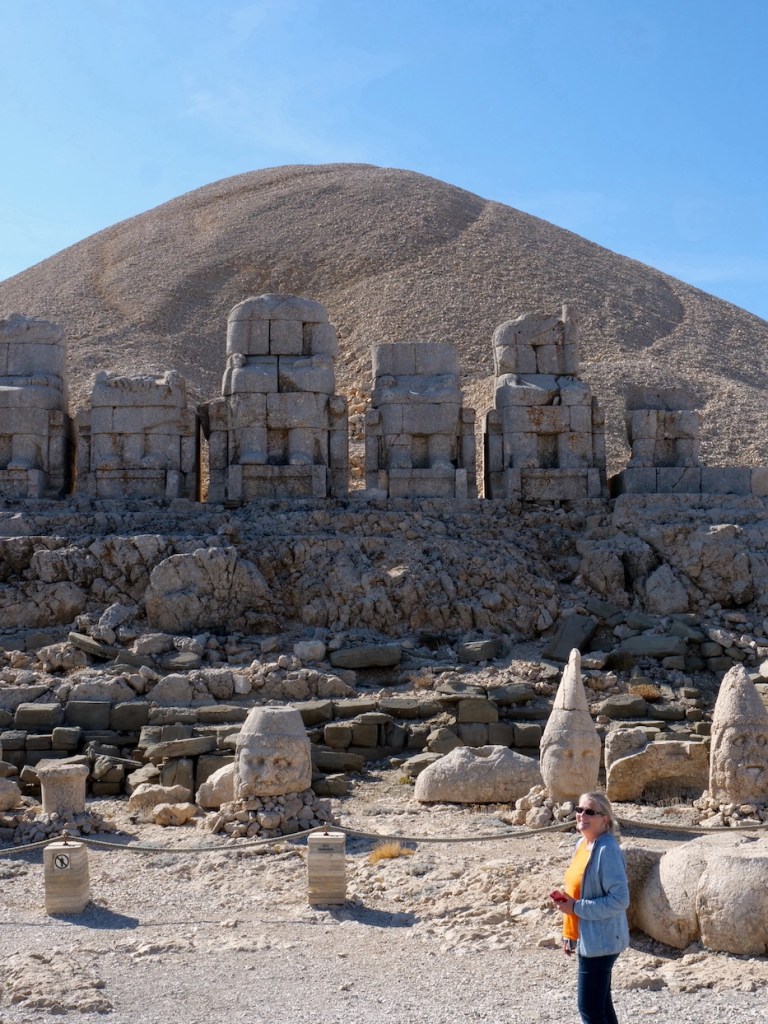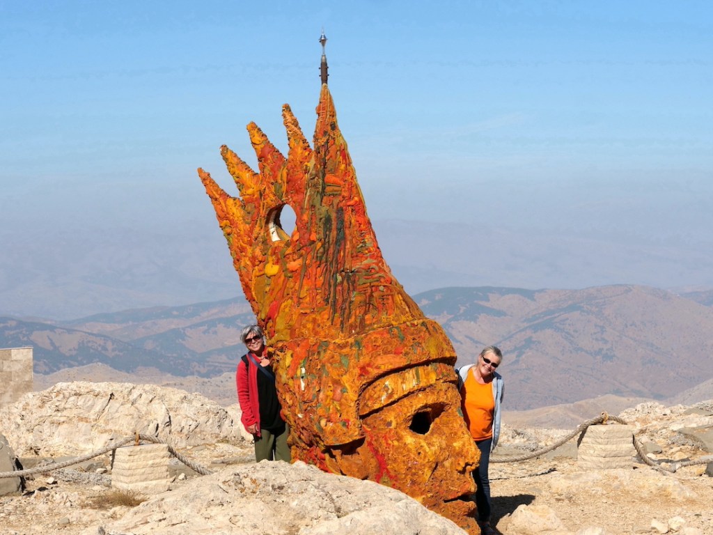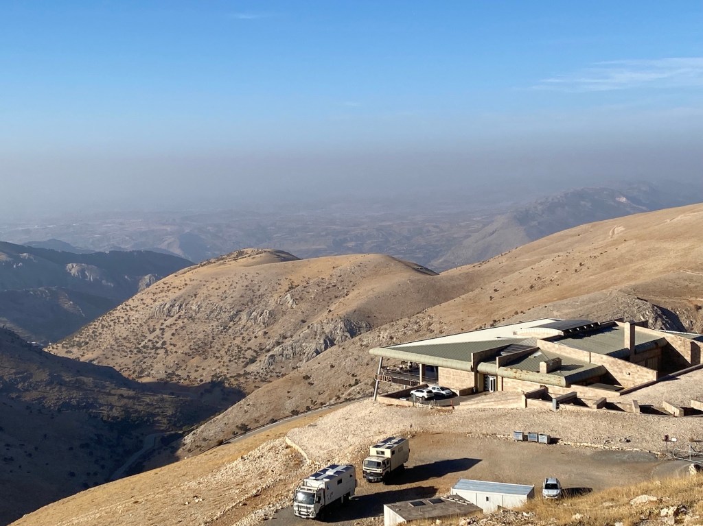 Kurz hinter der Nissibi-Brücke, die den Stausee quert, klettern unsere LKW auf teilweise sehr steilen Straßen wieder auf 2.100 Meter. Auf dem Berg Nemrut Dağı wollen wir eine Stätte besuchen, die gleichzeitig als Heiligtum und als Grabstätte gebaut – und nach heutigen Erkenntnissen nie fertiggestellt wurde.