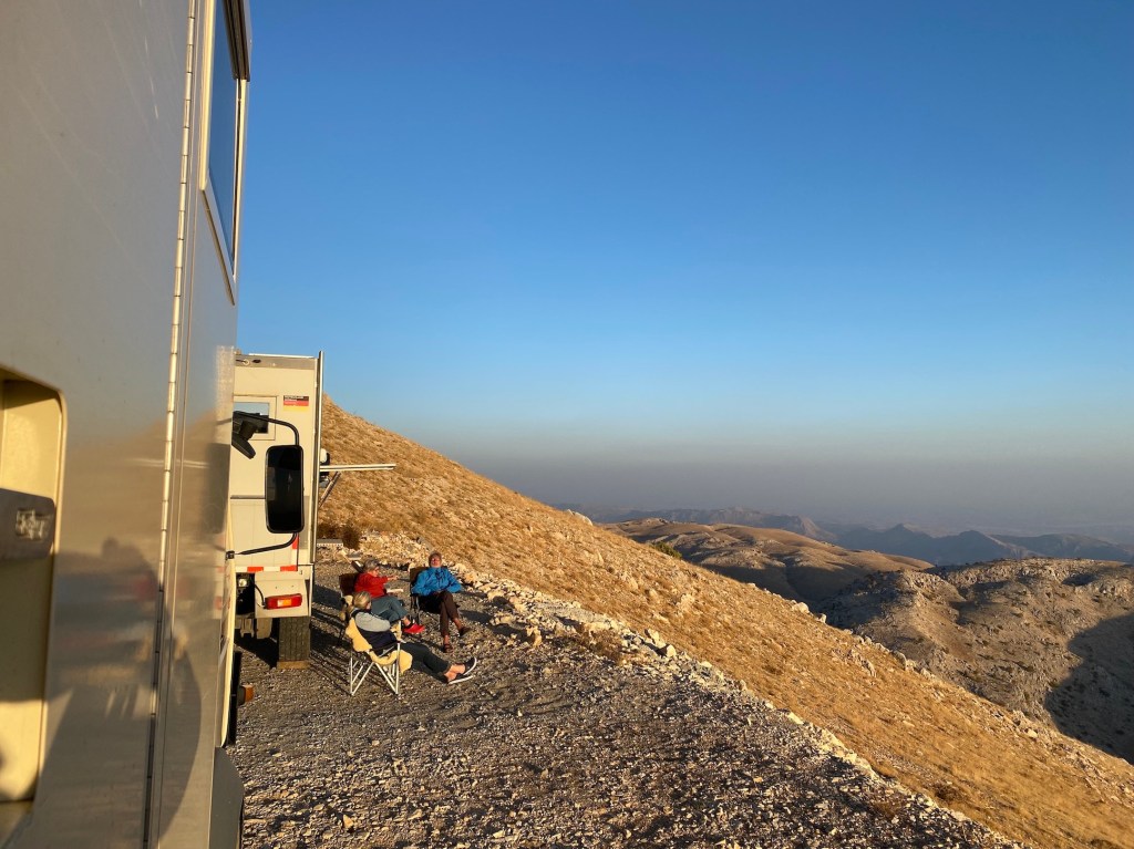 Und neben diesen über 2.000 Jahre alten Kunstwerken genießen wir eine fantastische Aussicht – sowohl tagsüber auf der Bergspitze als auch abends auf unserem Nachtstellplatz etwas weiter unterhalb.
