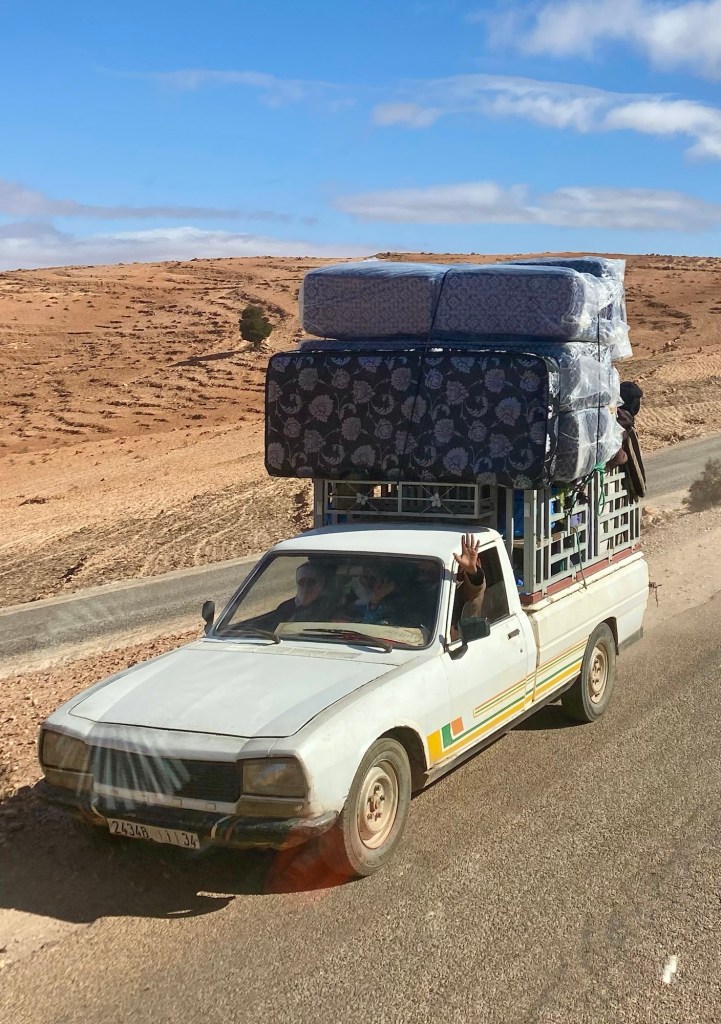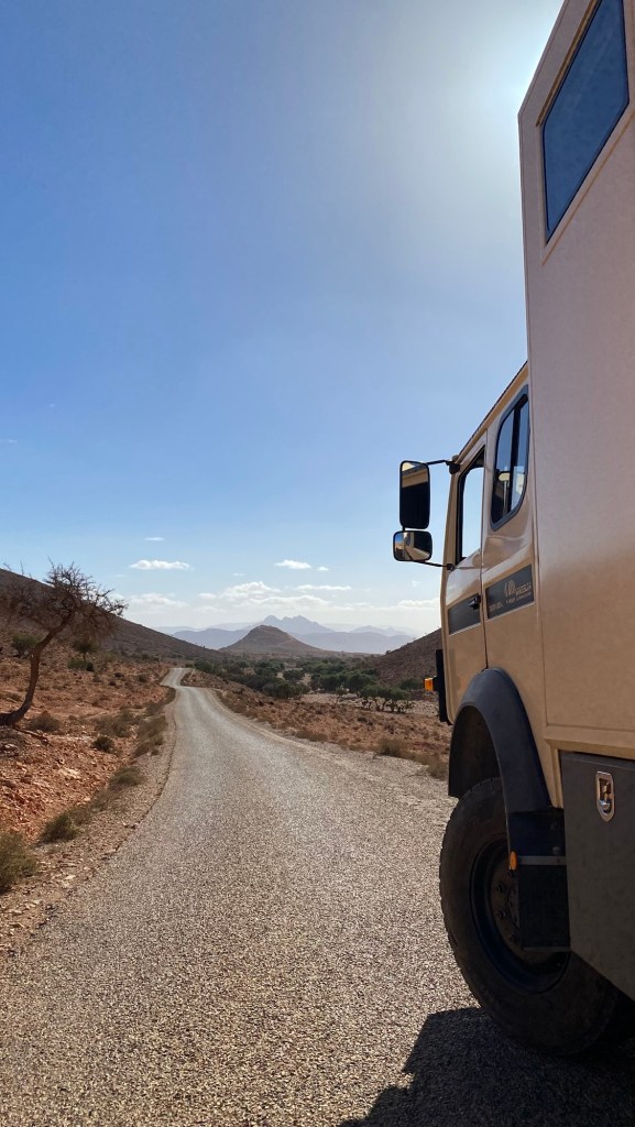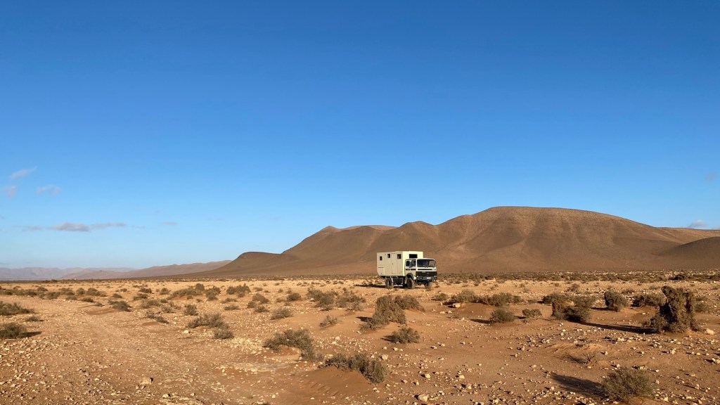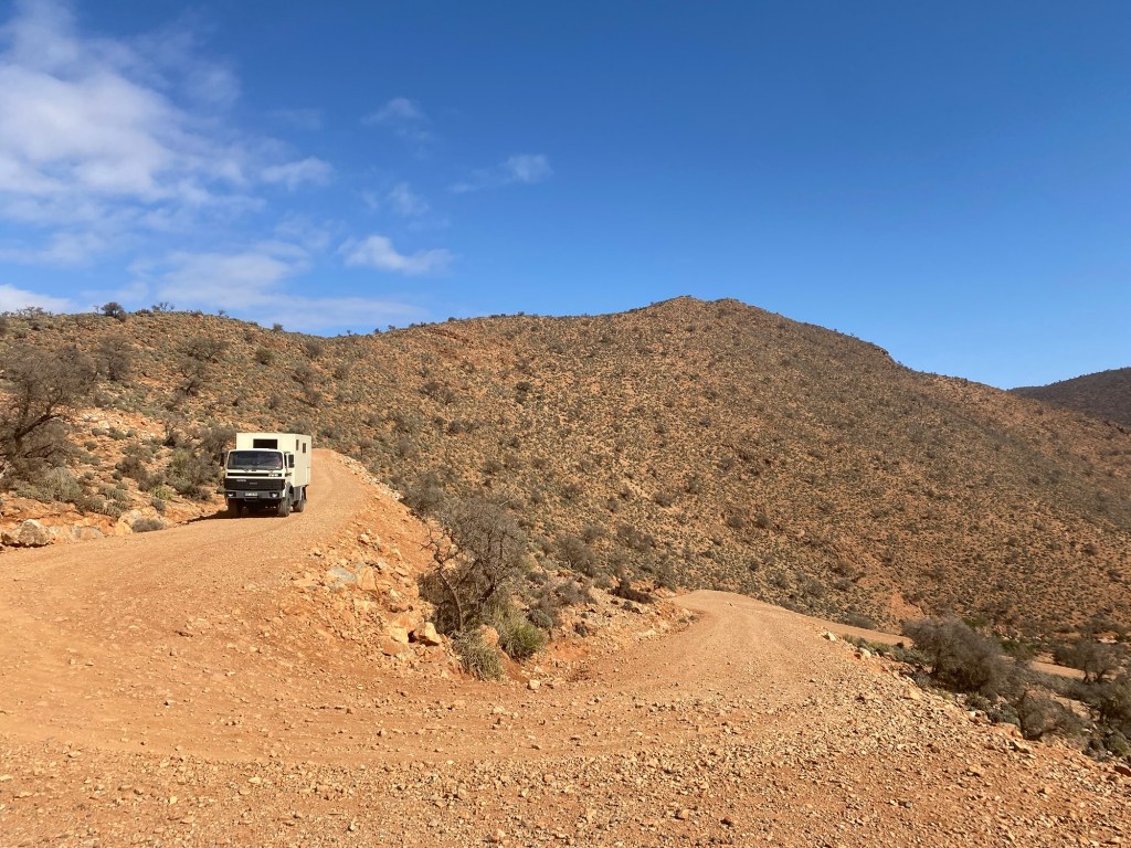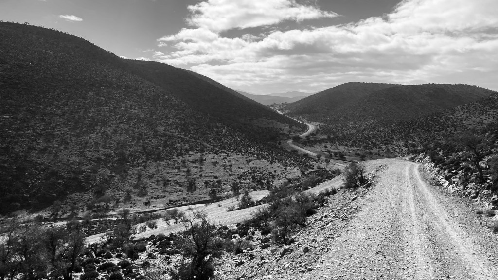 Wir hätten von der netten Oase bei Ouijane über Asphaltstraßen bis Fask fahren können. Aber die Versuchung war doch recht hoch, zwischen Start- und Zielpunkt auf der Karte eine Linie zu ziehen und uns dann auf kleinen Straßen und Pisten möglichst nahe an dieser gedachten Linie zu bewegen.