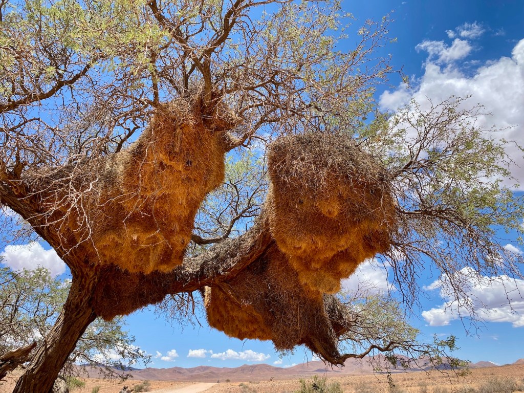 Die seltenen Bäume in dieser Gegend sind Heimat der Siedelweber. Diese bauen ihre Gemeinschaftsnester in Zusammenarbeit (die Männchen außen, die Weibchen sind für die Innenausstattung zuständig). Die Nester können bis zu 100 Jahre genutzt werden. Geschätzt 500 Vögel finden in einem Gemeinschaftsnest Zuflucht und die Gottesanbeterin sowie die Echse Kalahari-Skink sind gerngesehene Mitbewohner, weil sie die Kundschafter der Ernte-Termiten fressen, bevor diese die frohe Kunde eines großen Festessens an ihren Stamm weitergeben können. Schlau, nicht wahr?