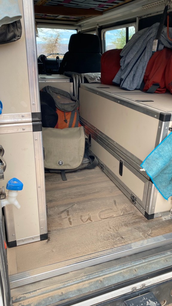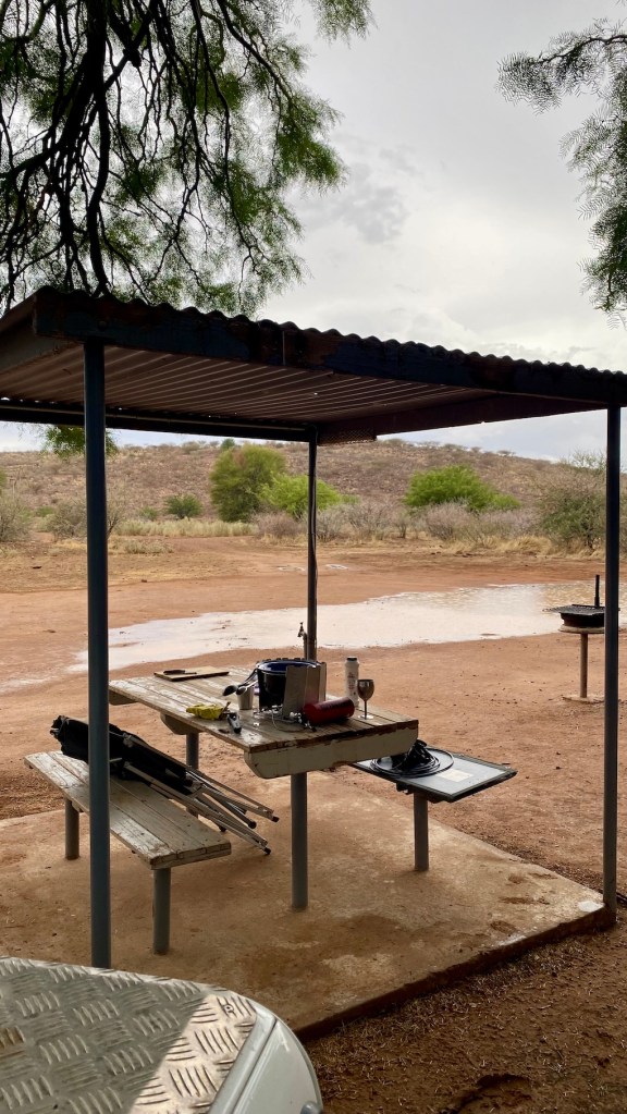 Wir wollen auch mal mit dem Vorurteil aufräumen, dass es in der Wüste nie regnet. Zugegebenermaßen ist Niederschlag selten, aber besonders zu Beginn dieses Jahres 2026 gab es durchaus reichliche wolkenbruchartige Niederschläge, denen wir mit unserer kleinen Markise nicht trotzen konnten. Da brauchte es schon etwas stabilere Konstruktionen, um trotz Regen das Abendessen bereiten zu können 😊.