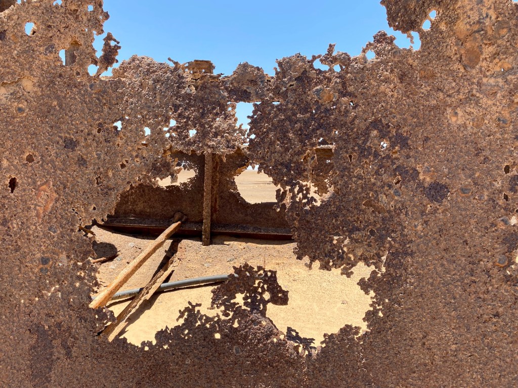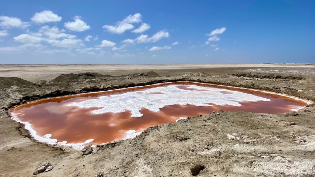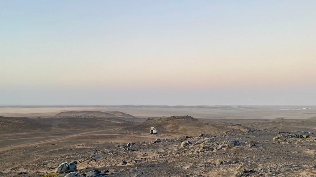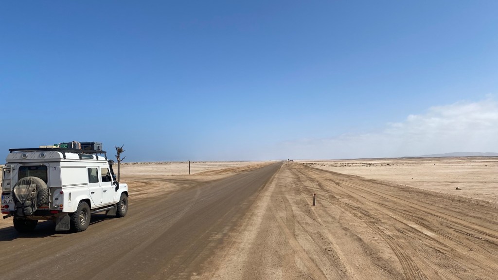 Apropos Salzstraße: Natürlich gehört am Atlantik das Salz zu den relativ leicht zu gewinnenden Rohstoffen. Neben der Verwendung als Lebensmittel kommt es in diesem Bereich auch im Straßenbau zum Einsatz. Große Tanklastzüge mit Salzlösung sprühen ihren Inhalt auf die Piste. Die Lauge trocknet und hinterlässt eine bequem zu fahrende, glatte Oberfläche. Zwei Nachteile dieses günstigen Straßenbelags liegen auf der Hand: Zum einen wird eine Salzpiste bei den seltenen Regenfällen zu einer schmierig-glitschigen Rutschpartie, und zum anderen freut sich unser Defender überhaupt nicht über die ständige Ablagerung von Salzstaub. Gottlob hat es nicht geregnet und ein Auto kann ja auch gewaschen werden ☺️.