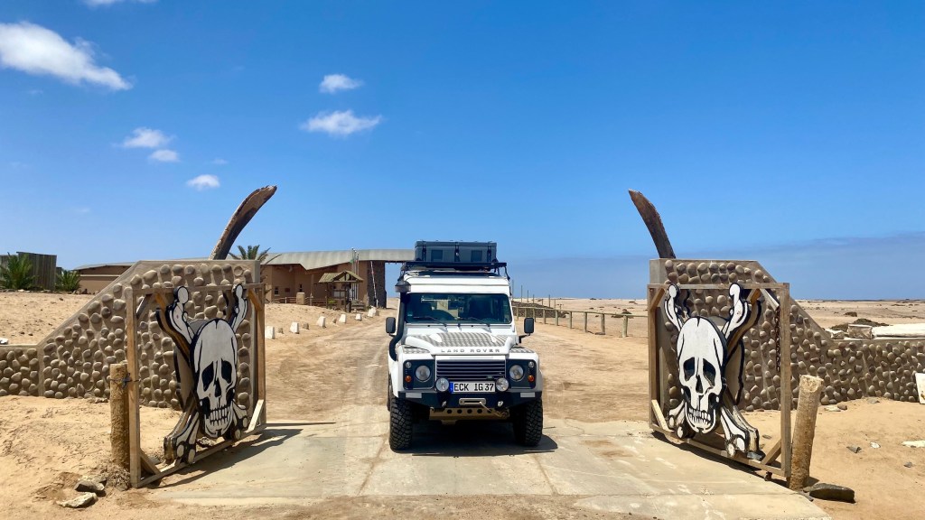 Nördlich von Swakopmund führt eine Salzstraße immer in Sichtweite des Atlantik durch die karge Landschaft. Die Namib-Wüste erstreckt sich weiter, die ausgedehnten Sanddünen des Südens verschwinden und zurück bleibt eine eintönige, meist nur leicht hügelige Landschaft. In diesem Bereich ist sie als Namib-Skeleton Coast National Park streng geschützt.