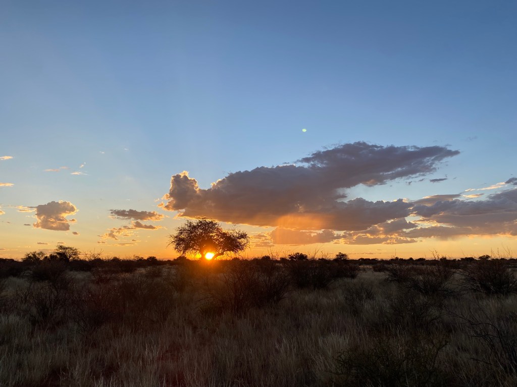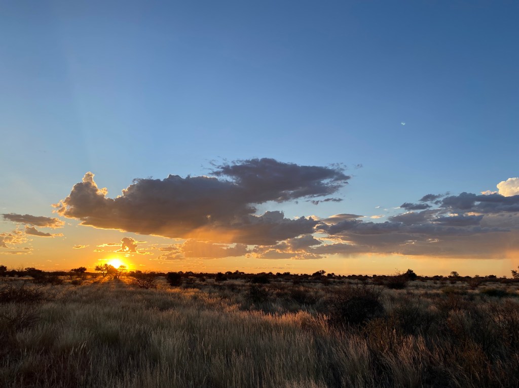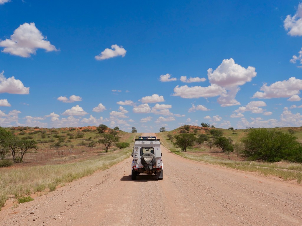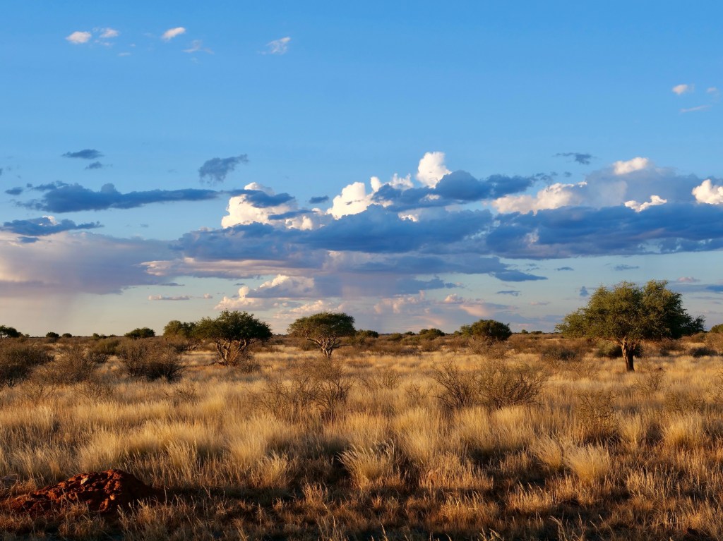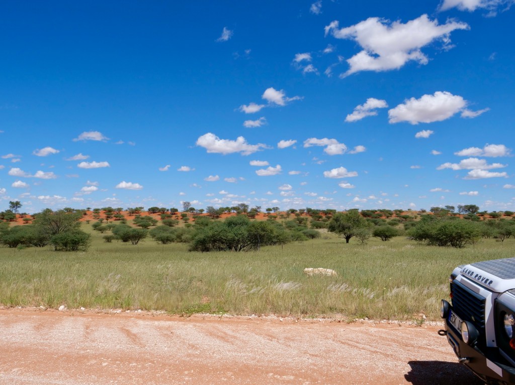 Wir wollen den namibischen Teil der Kalahari kennenlernen. Diese Trockensavanne erstreckt sich über eine Fläche von mehr als einer Million Quadratkilometer und bedeckt große Teile von Botswana, den Osten von Namibia sowie das Nordkap in Südafrika. Der durch Verwitterung entstandene Sand erreicht eine Stärke von 200 Metern; durch Winderosion formten sich Dünen, die jedoch seit ca. 10.000 Jahren aufgrund des zunehmenden Bewuchses nicht mehr wandern.