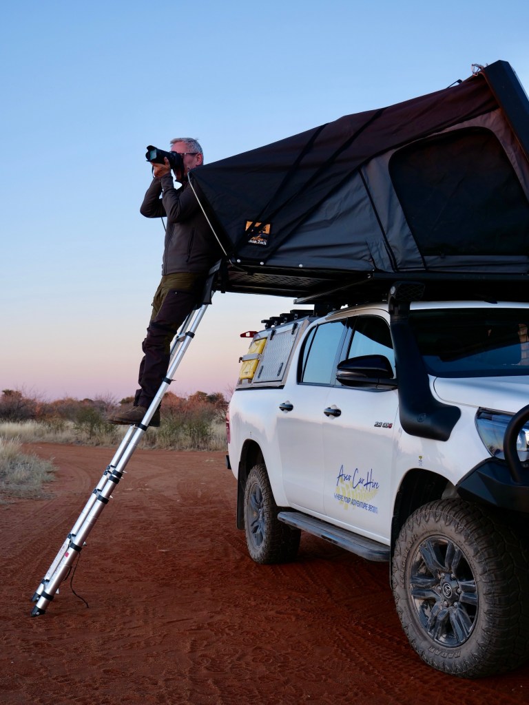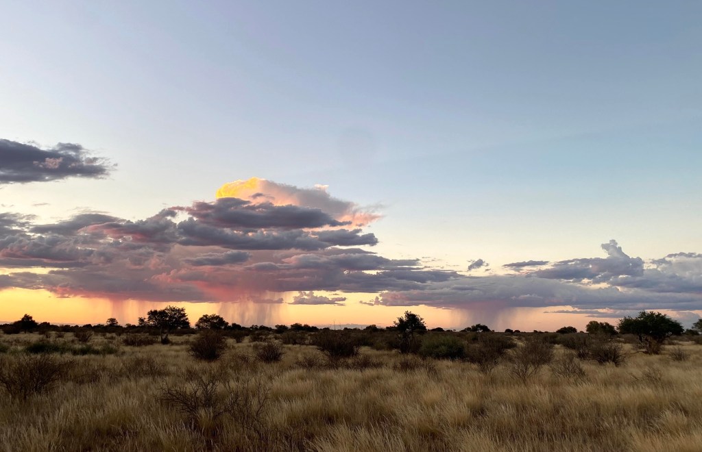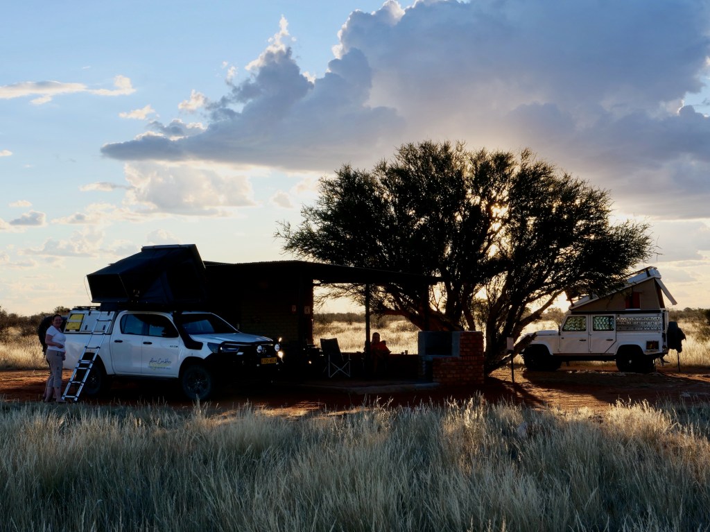 Wir „schießen“ die seltenen Tiere nur mit der Kamera. Schwarze und „bunte“ Springböcke in trauter Eintracht.Mitten drin! Die Crew genießt den SonnenuntergangUnd wir haben mit Daggi und Fred aus der alten Heimat sehr sympathische Gesellschaft 😊Für das perfekte Bild ist kein Einsatz zu klein 😉Es gibt Momente, da möchte man die Zeit anhalten……oder lieber nicht, denn jede Sekunde…… bringt neue Wunder!Wir waren umzingelt von Gewittern, bekamen selbst aber nichts ab.Die Flussterassen des Auob River begleiten uns südlich von StampfetStetiges Auf und Nieder beim Dünenreiten. Ob wohl die Bauleitung der Siedelweber absichtlich ein Dromedar nachbilden wollte?
