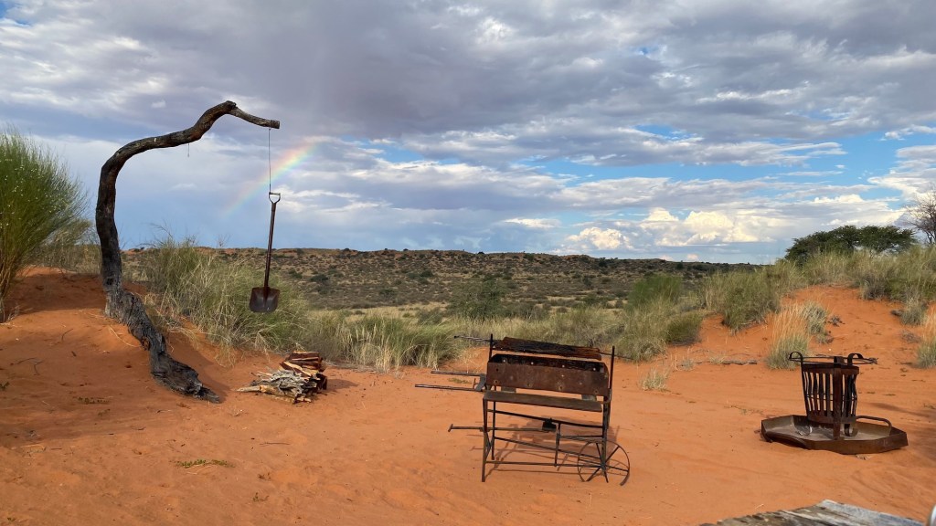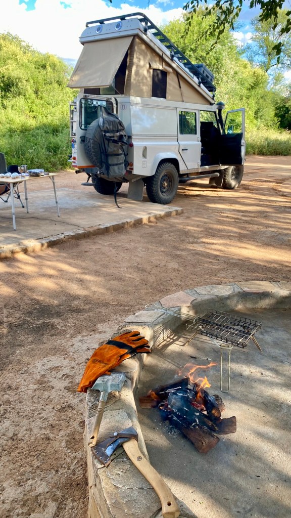 Aber erstmal eine Stärkung vom Grill. Die Feuerstelle ist eher für Großfeuer konzipiert, da wirkt unsere Braai-Stelle doch eher niedlich.