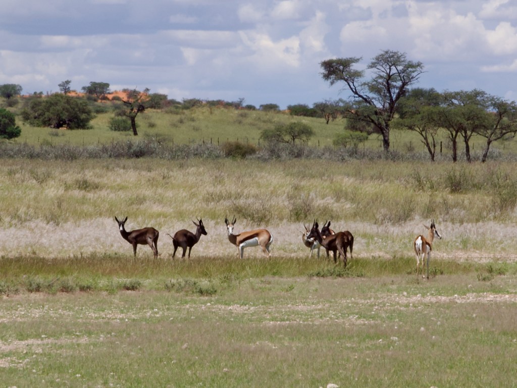 Unterwegs treffen wir auf eine Besonderheit. In einem Farmgelände sehen wir nahezu schwarz gefärbte Antilopen, die jedoch die Statur und Kopfform wie unsere altbekannten Springböcke haben. Die nachfolgende Recherche zeigt uns, dass es sich tatsächlich um so genannte „schwarze Springböcke“ handelt. Hierbei sorgt eine rezessive Genmutation für die dunkle Färbung der Tiere. Und weil der Mensch ist, wie er halt ist 🙄, sind die schwarzen Springböcke eine beliebte Jagdtrophäe. Das führt dazu, dass Farmer versuchen, möglichst viele dieser besonderen Tiere zu „züchten“, um sie den Jagdfarmen gegen fürstliches Entgelt liefern zu können
