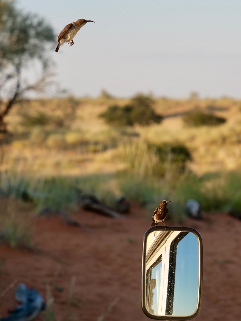 Roter Sand, grünes Gras und viele nette Details, die sich die Gastgeber haben einfallen lassen.Kein Streulicht und nur die Geräusche der Natur. Am Morgen finden die Sunbirds (Nektarvogel) Gefallen an unserem Außenspiegel.Wir wären gern geblieben, hatten aber blöderweise nicht genug Bargeld. Kartenzahlung ist hier im Outback nicht möglich.